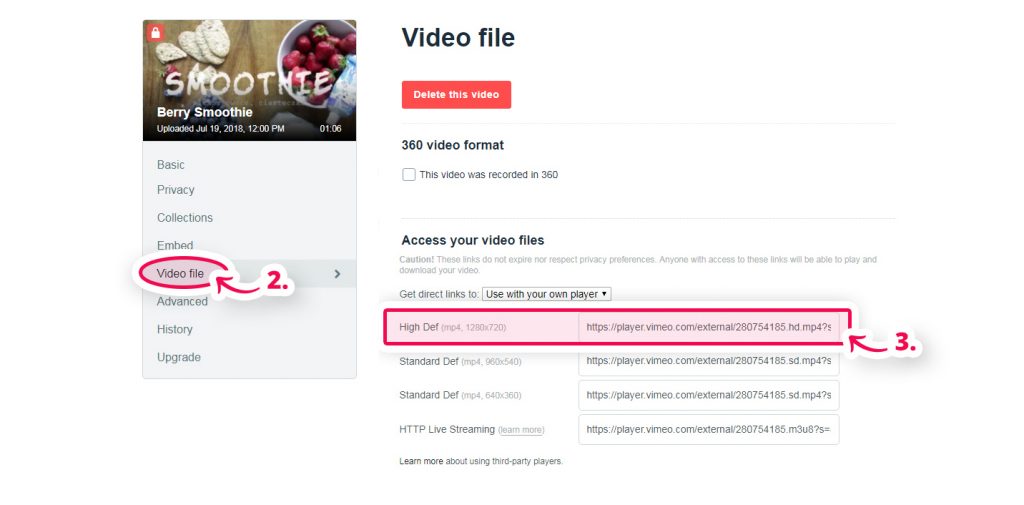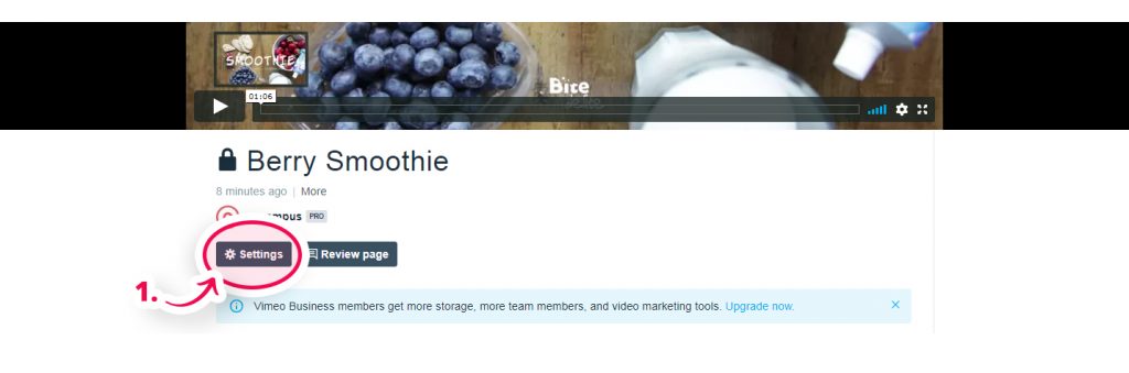 Krok 1: po opublikowaniu wideo w usłudze vimeo Pro, kliknij przycisk Settings.