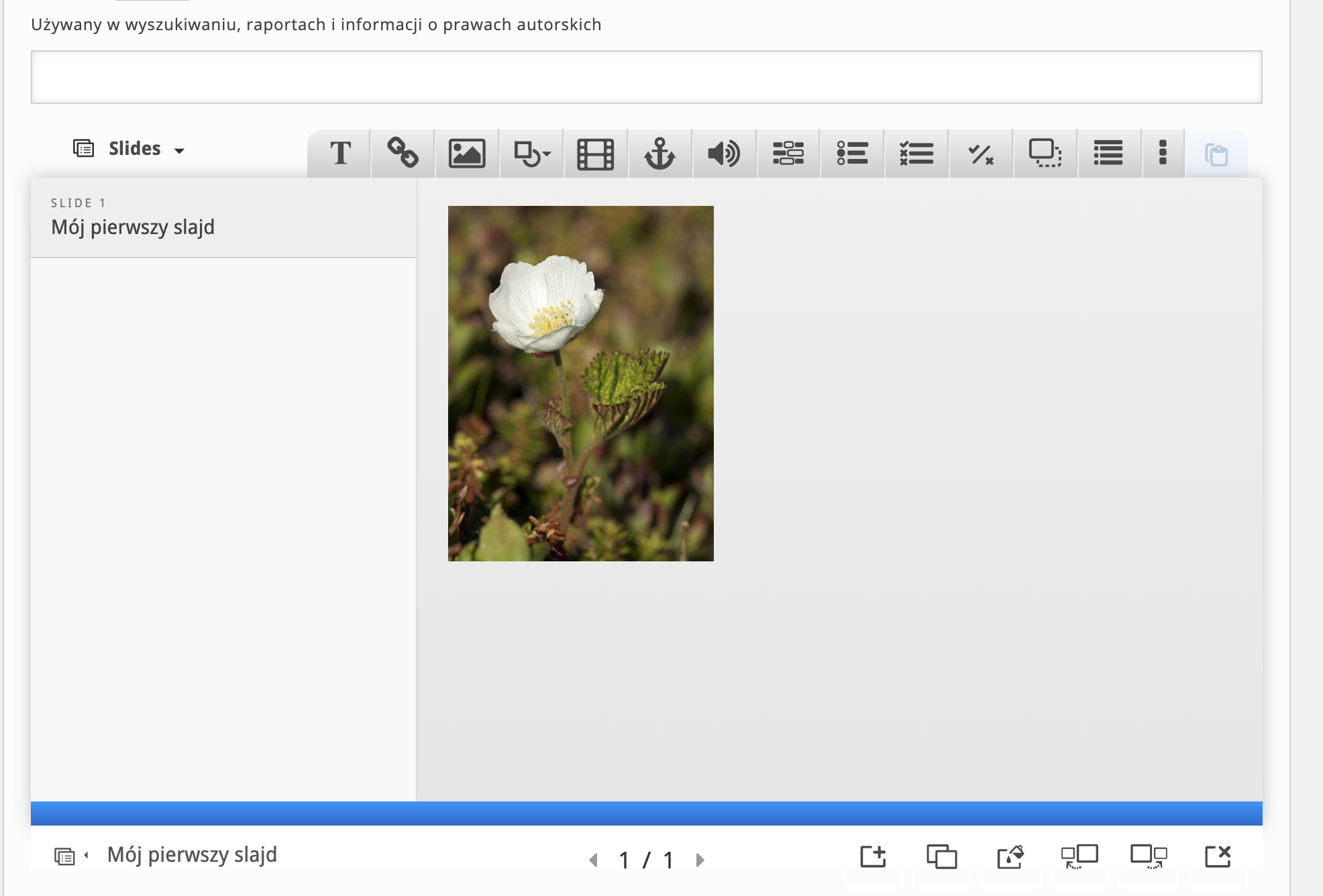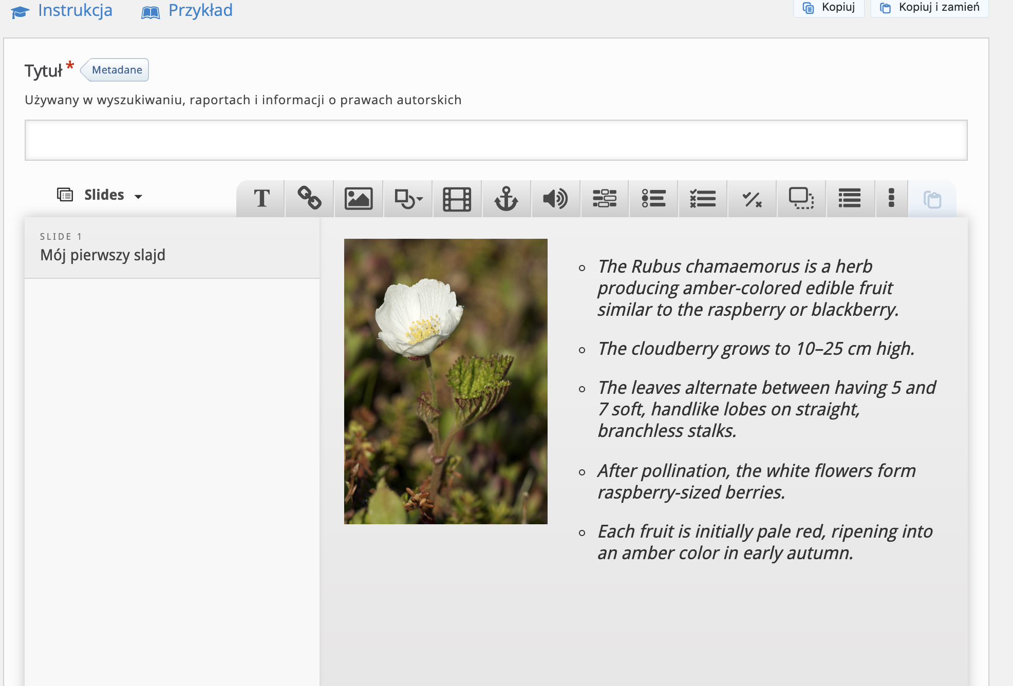 Z górnego paska edytora możemy wstawiać elementy znajdujące się w slajdzie.