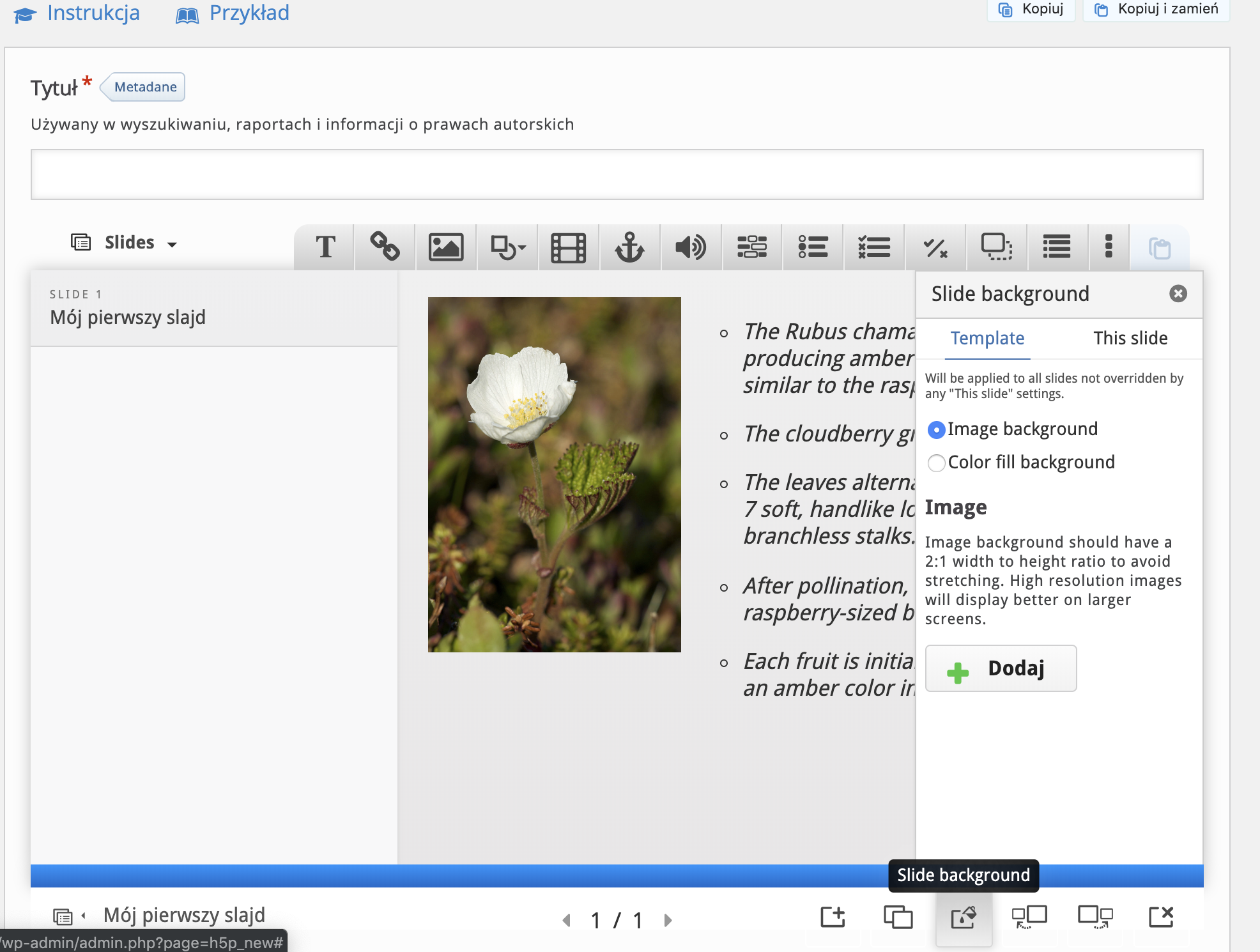 Tło slajdów możemy zmienić klikając w prawym dolnym rogu na przycisk “Slide background“.