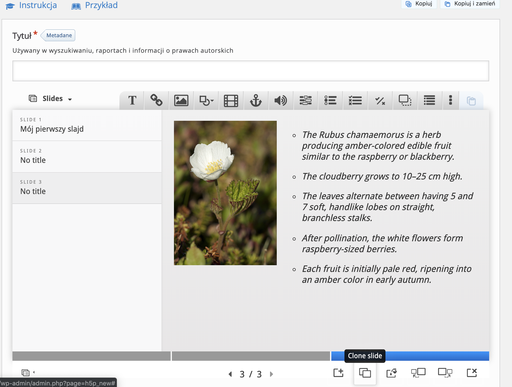 Klikamy na przycisk w prawym dolnym rogu “Clone slide” i na lewym pasku pokazuje się drugi powielony slajd, wraz z zawartością poprzedniego.