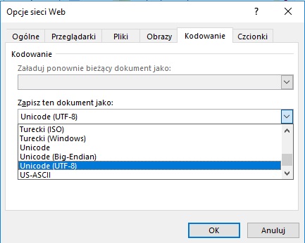 3. Otworzy się nam następne okno, w którym w zakładce poziomej “Kodowanie” w opcji “Zapisz ten dokument jako:” wybieramy kodowanie UTF-8 i zapisujemy plik.