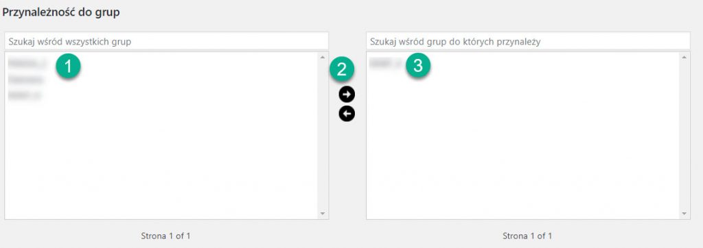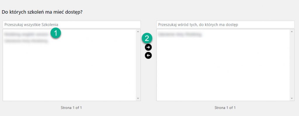 5. zaznacz szkolenie w kolumnie (1) po lewej, a następnie kliknij strzałkę w prawo (2). Wybrane szkolenie zostanie przesunięte do kolumny po prawej.
