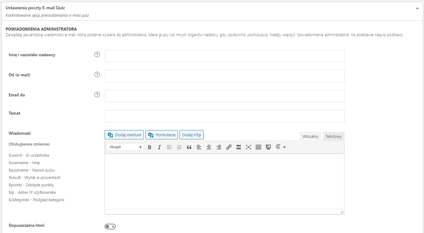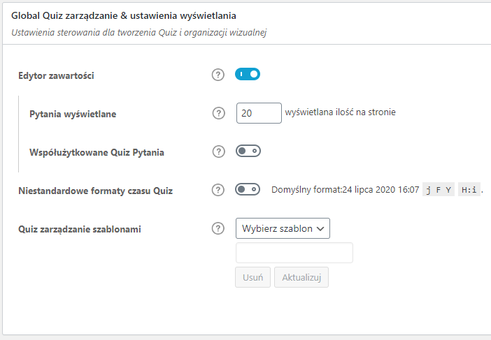 Te opcje będą stosowane globalnie do wszystkich quizów na Twojej platformie: