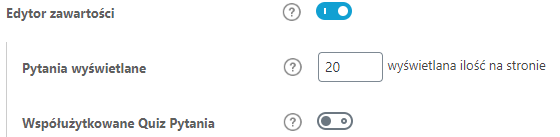 • Pytania wyświetlane: oznacza maksymalną liczbę pytań, które pojawią się w edytorze zawartości quizów przed wyświetleniem paginacji na dole. W przypadku dużych quizów zmniejszenie tej liczby może ułatwić zarządzanie quizami w kreatorze.