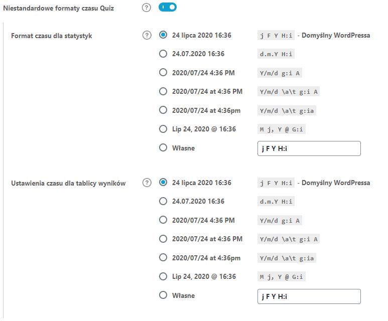 Domyślnie platforma użyje predefiniowanego formatu daty i czasu do statystyk quizów i tabeli wyników tych quizów. Włącz to ustawienie, jeśli chcesz używać niestandardowego formatu daty / godziny. Po włączeniu będziesz mieć dwie opcje: